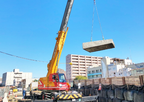 工期短縮と騒音を防ぐため、両サイドにあった古い擁壁はワイヤーソーとウォールソーにて切断し、吊り上げて撤去。