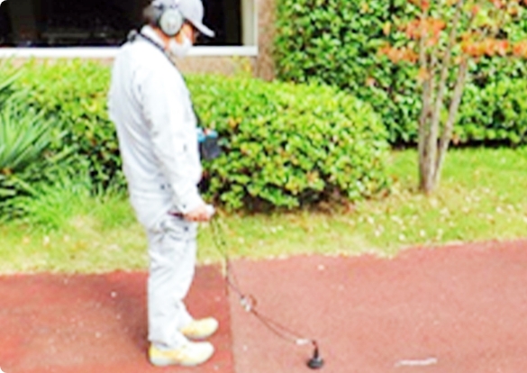 路面上から漏水探知機を使用し、埋設配管に発生した漏水音を探知し漏水箇所を検出します。
